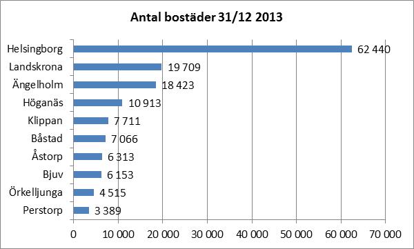 Helsingborg är den i särklass största staden med över 62 000 bostäder. Landskrona är lite större än Ängelholm. Den kommun som har minst antal bostäder är Perstorp med cirka 3 400 stycken.